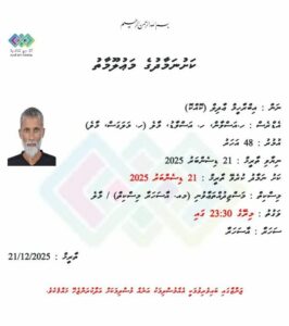 އާދިލްގެ ޖަނާޒާ އޮންނާނީ މިރޭ 23:30ގައި މަސްޖިދުއްތަޢާވުނި (އާސަހަރާ) މިސްކިތުގައިއެވެ. އާދިލް ނިޔާވީ ގިނަ ދުވަސްތަކެއް ވަންދެން ކެންސަރު ބައްޔަށް ފަރުވާ ހޯދަމުން ދަނިކޮށް މިރޭގެ ވަގުތެއްގައިއެވެ.