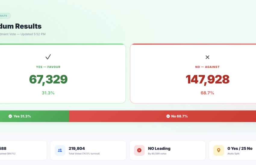 4 އެޕްރީލް 2026 ވީ ހޮނިހިރު ދުވަހު ބޭއްވި ފެންނަ ނުފެންނަ ވޯޓުގައި، ރިޔާސީ އިންތިޚާބާއި ރައްޔިތުންގެ މަޖިލީހުގެ އިންތިޚާބު އެއްކޮށްލުމަށް ސަރުކާރުން ހުށަހެޅި ހުށަހެޅުމަށް ހުރިހައި އަތޮޅަކުން ވެސް ނޫނެކޭ ބުނެފިއެވެ.